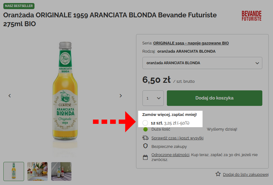 - Kliknij w specjalne pole „12 szt. (-50%)” widoczne przy wyborze ilości lub wpisz ręcznie liczbę 12 w polu ilości.